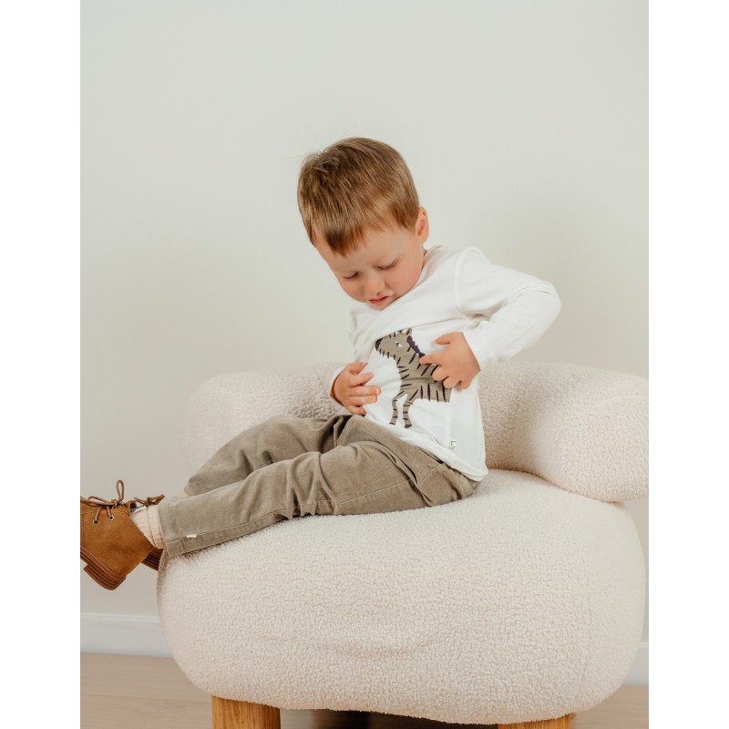 Confectionné en velours côtelé, ce pantalon kaki allie douceur, confort et élégance pour les petits garçons. Doté de deux poches cousues et de deux boutons en corne à l’arrière, il mise sur les détails pour un style raffiné. Parfait pour les saisons plus fraîches, il se distingue aussi par son bord élastiqué aux chevilles, à la fois pratique et charmant.
