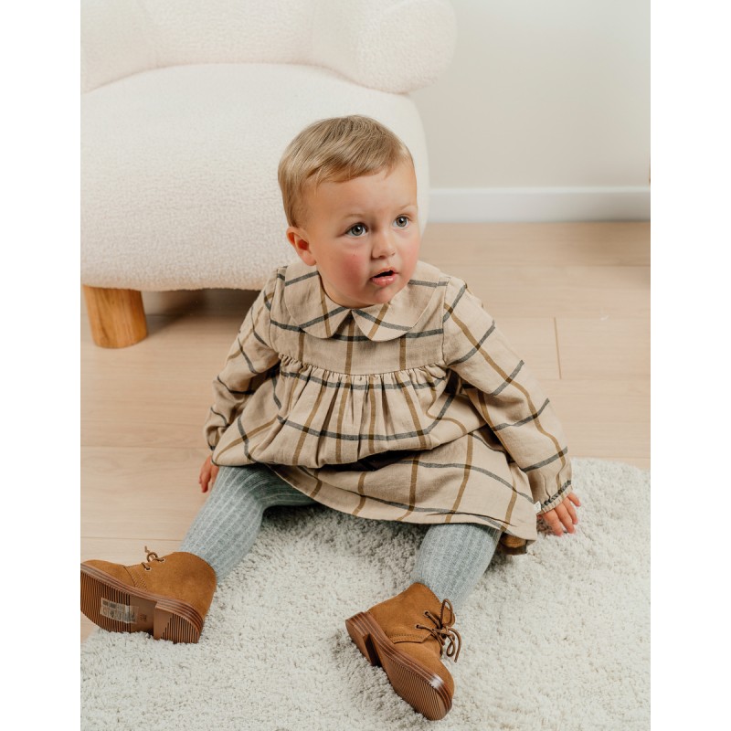 Une ravissante robe à carreaux beige, confectionnée en coton doux pour offrir confort et légèreté à bébé. Son col plat et ses manches bouffantes resserrées ajoutent une touche d’élégance au quotidien. Avec sa coupe fluide et sa taille froncée, elle est parfaite pour toutes les occasions.