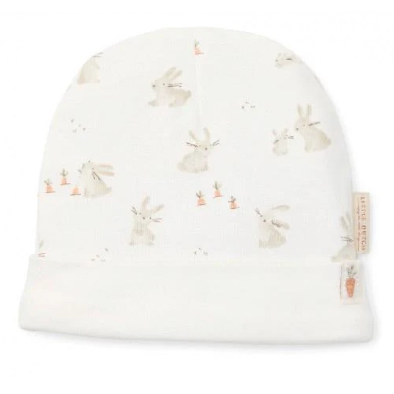 Hé cher lapin! Ce chapeau avec imprimé lapin est trop mignon. Il est fait d'un coton biologique merveilleusement doux pour garder la tête de votre tout-petit agréable et chaleureux. Grâce à l'élastique, le chapeau reste en place. Sur le chapeau, il y a des étiquettes avec le petit logo néerlandais et l'icône Wortel.