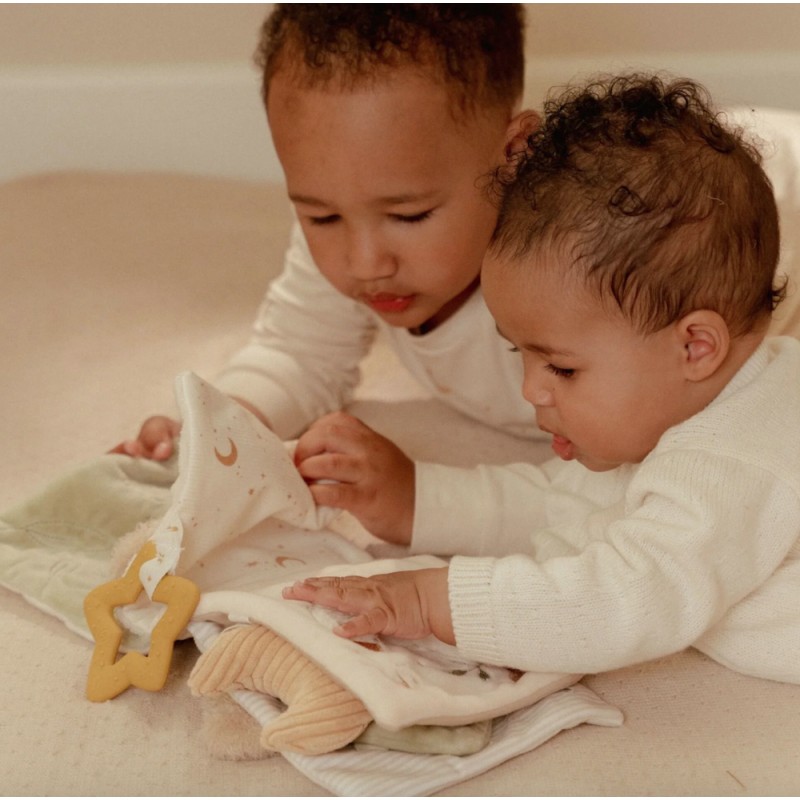 Tu n'as pas besoin de t'ennuyer avec ce doux livre d'activités de Newborn Naturals. Baby bunny et Little Goose t'emmènent dans une aventure ludique. Il y a beaucoup à découvrir avec les différentes textures et activités, comme un petit miroir, un hochet et des jouets cachés. Le livre doux a également différentes étiquettes à toucher. Ce livre stimule non seulement les sens, mais est également bon pour le développement de la coordination main-œil.