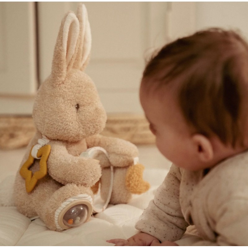 Rencontrez Baby Bunny, le doux compagnon qui rend le jeu et la découverte encore plus amusants! Cette peluche d'activités stimule les sens avec différentes textures, des hochets et des petites étiquettes ludiques. Parfait pour être saisi, câliné et pour stimuler la motricité. Grâce à son format pratique, il est idéal pour les petites mains à saisir et à explorer. Un adorable compagnon câlin qui invite à un plaisir de jeu sans fin. Pour les petits aventuriers avec une grande curiosité!