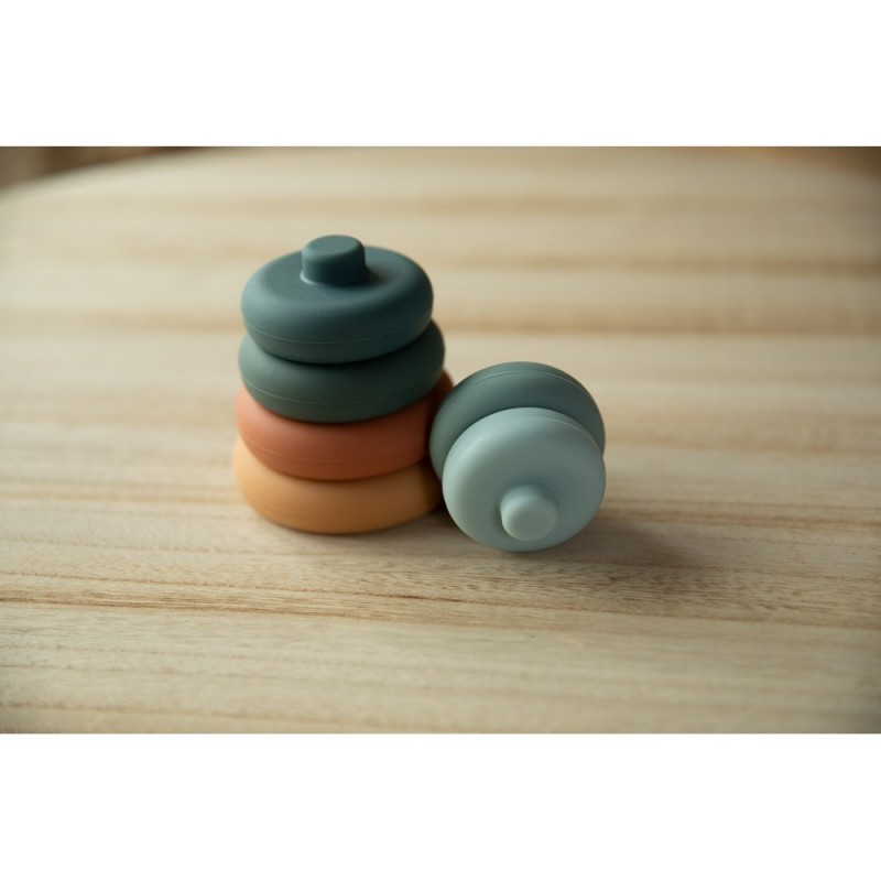 Un grand classique revisité, la tour à empiler multicolore en silicone pour un produit durable et sain.