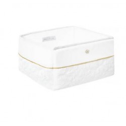 Panière Délicatesse nacre en percale de coton émérisée et broderies. Dimensions : 25 x 25 cm. La ligne Délicatesse : Le raffinement et l'élégance de cette ligne illuminent l'univers féérique de la petite fille. Plastron en percale brodée, fils d'or et signature nacrée réhaussent avec modernité les lignes épurées de cette collection. Fabriqué au Portugal.