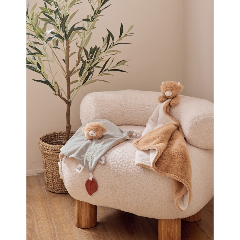 L’extérieur tout doux est dans une teinte taupe apaisante, tandis que l’intérieur écru ajoute une touche de lumière et de tendresse. Grâce à son petit lien intégré, la couverture se roule facilement pour se glisser dans le sac à langer et suivre bébé partout.