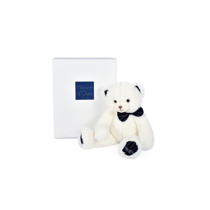 Un bel Ours ivoire particulièrement très chic avec son petit noeud papillon et ses accessoires en joli tissu bleu marine finement rayé par un fil argent. Un joli pantin souple et très doux pour petits et grands, que chacun appréciera pour jouer, cajoler ou décorer la chambre. Présenté dans une belle boîte, c'est un cadeau idéal dès la naissance.